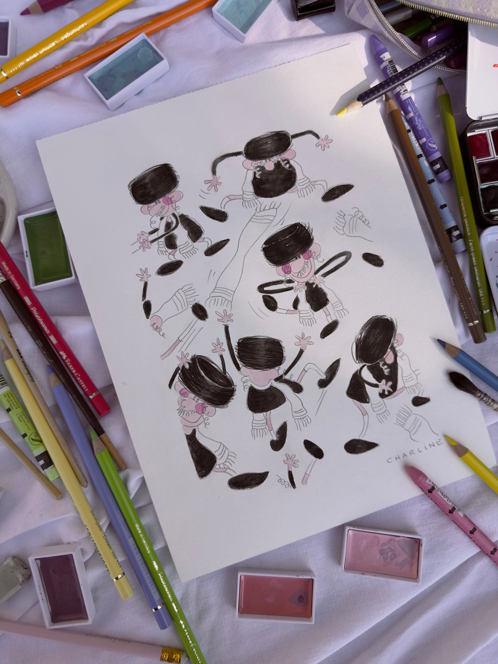 Je me suis amusée à reproduire chaque mouvement de la chorégraphie : les pas, les tours, les bras levés, toute la vivacité d’une danse à la fois burlesque et universelle.