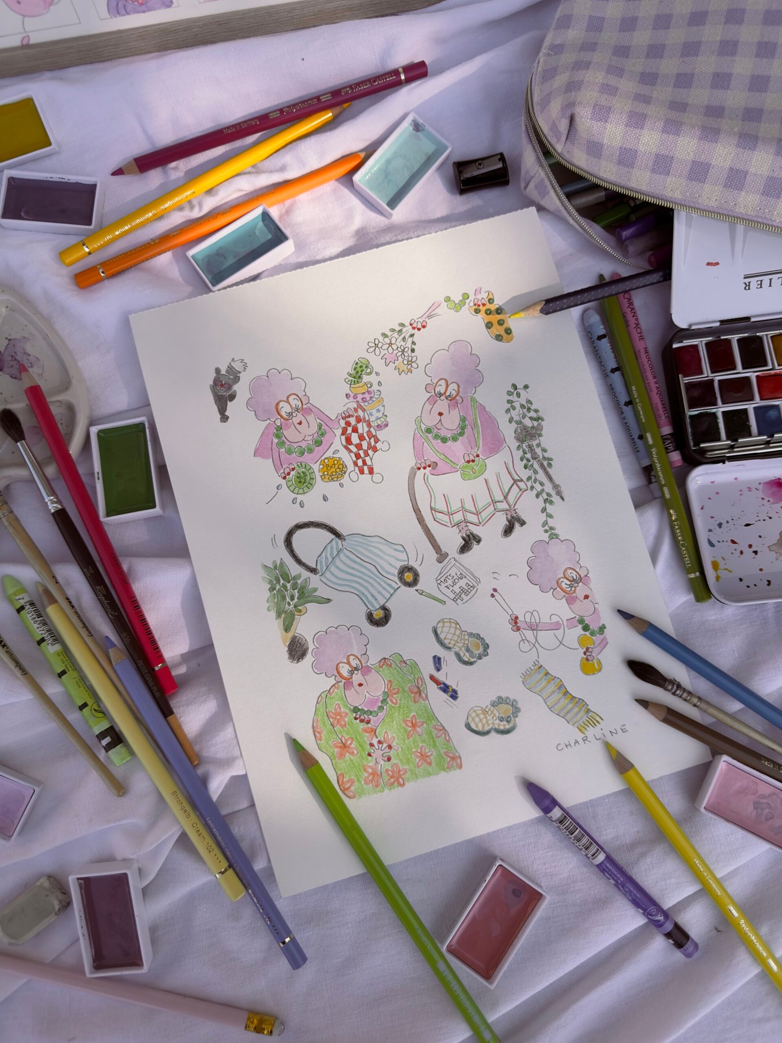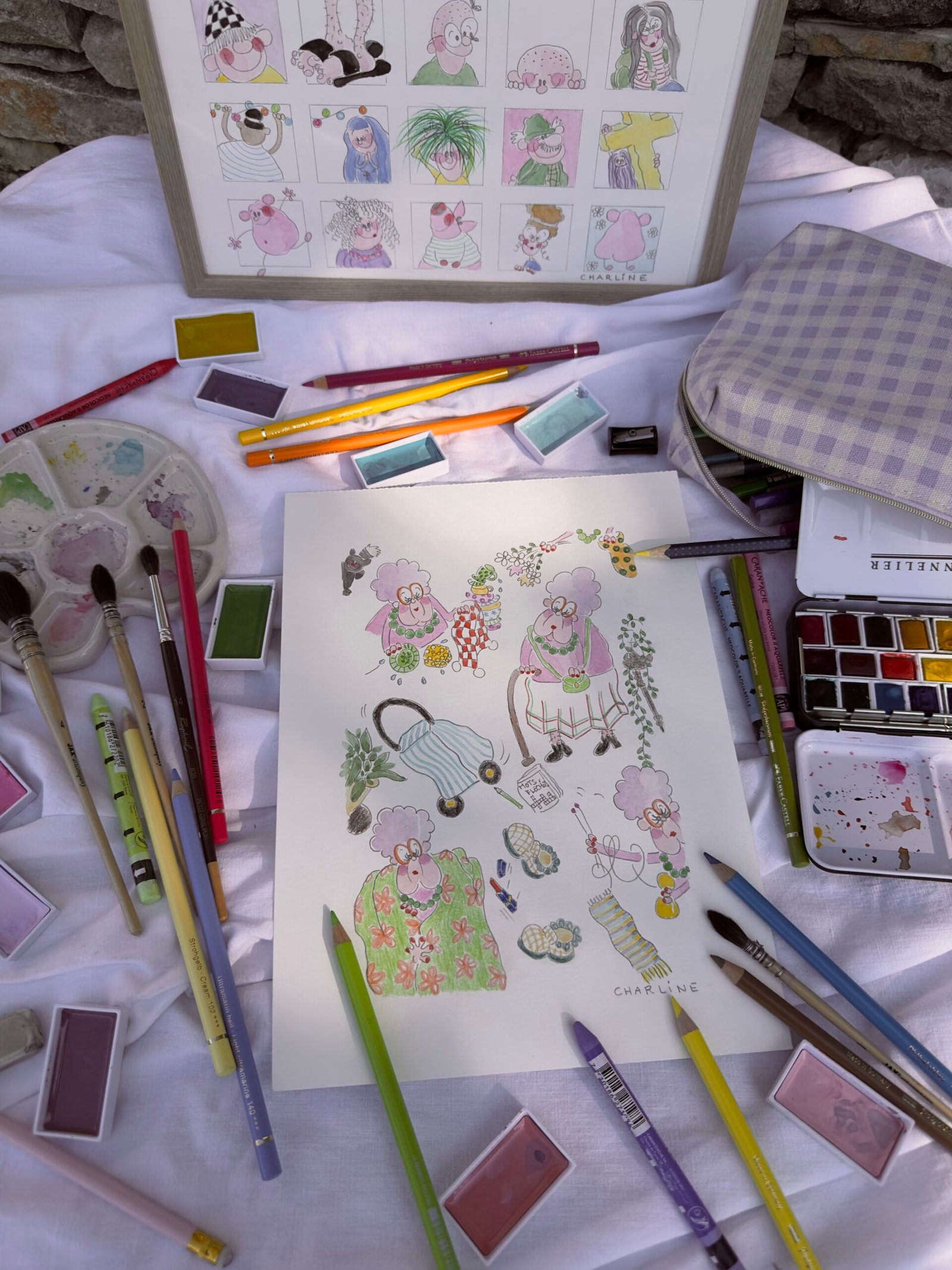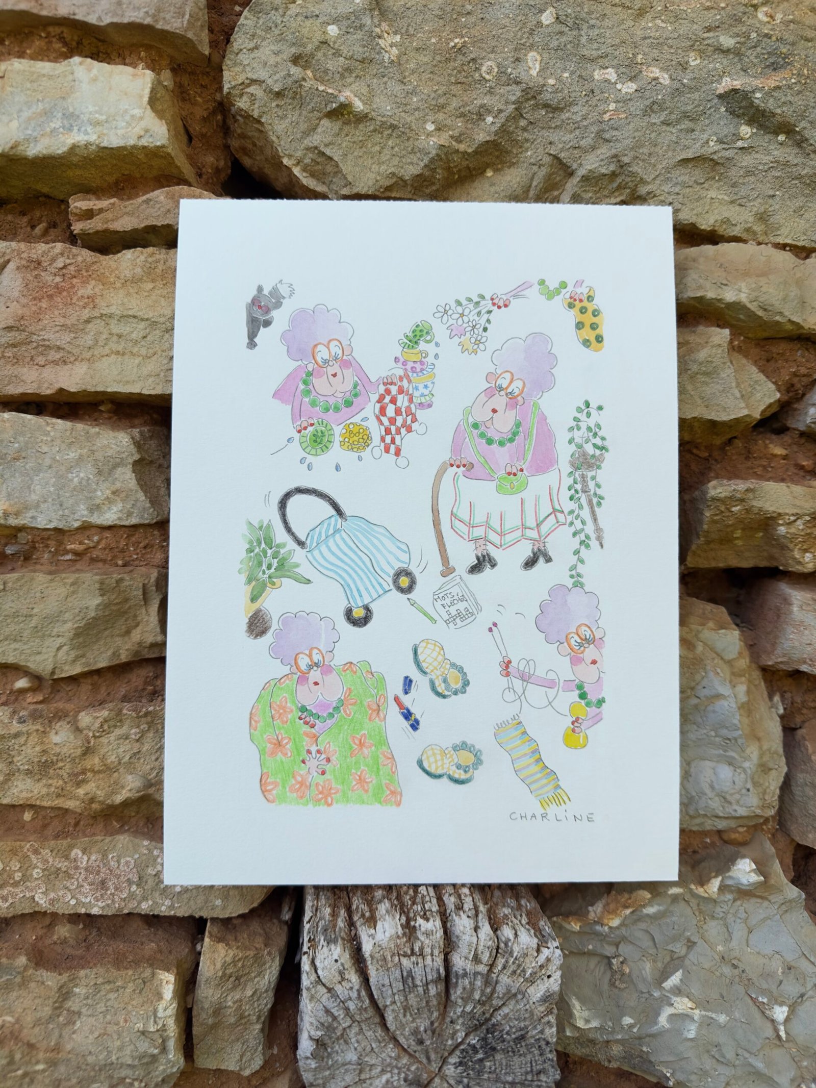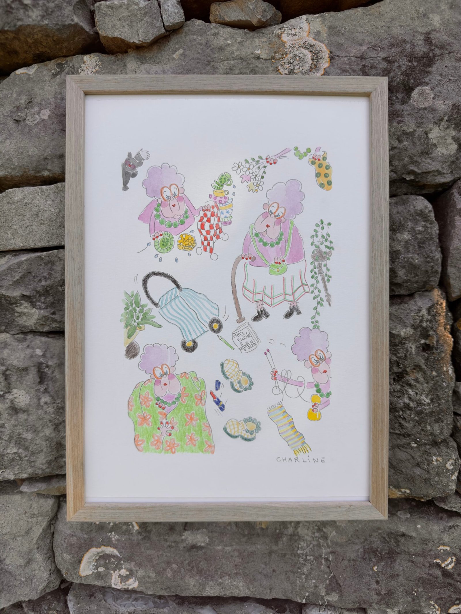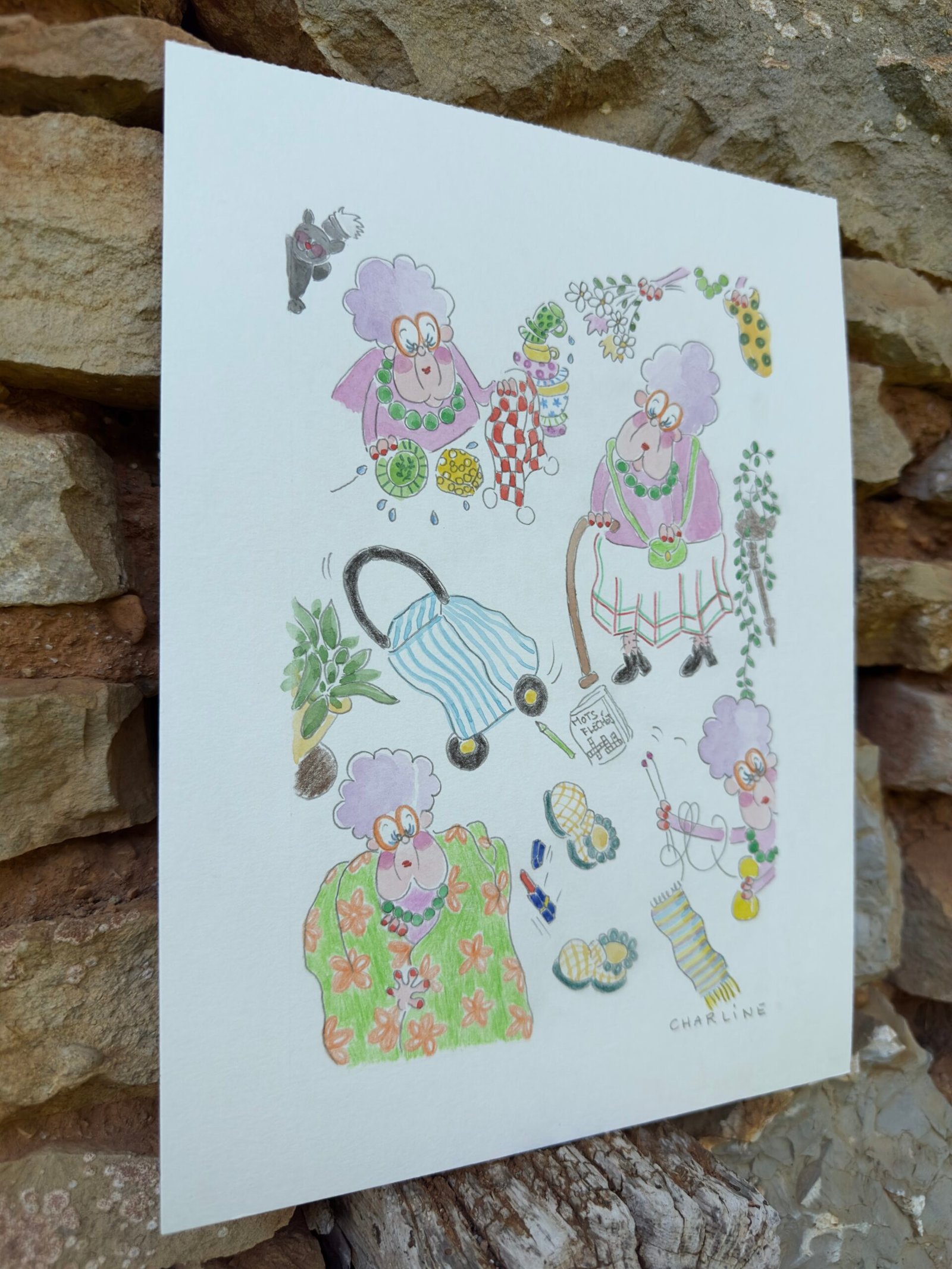 Illustration originale à l’aquarelle "mémé Colette", création unique et expressive de Charline Dailly, issue de son univers coloré et poétique.Mamie Henriette